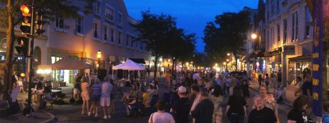 Picture of lit street in the evening for Friday night live. Food, family, music, good cheer and more…